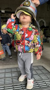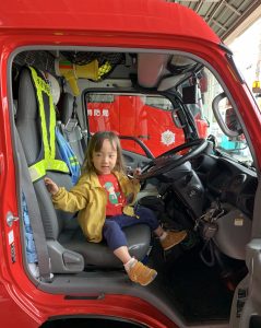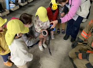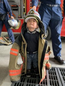 消防士さんが来ている帽子やジャケットを着せてもらったり、運転席に乗せてもらったり