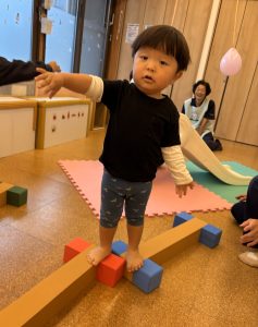 エバテムという玩具を使い平均台にしてそーっと両手でバランスをとって歩いていました😊😊